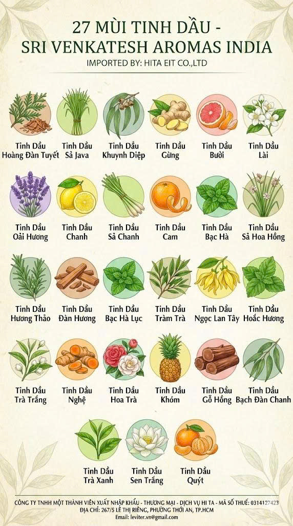 👉 HITA EIT CO., LTD chuyên nhập khẩu & phân phối tinh dầu Ấn Độ chính hãng Sri Venkatesh Aromas, đạt chuẩn GMP – ISO 9001:2015, phục vụ cho:
