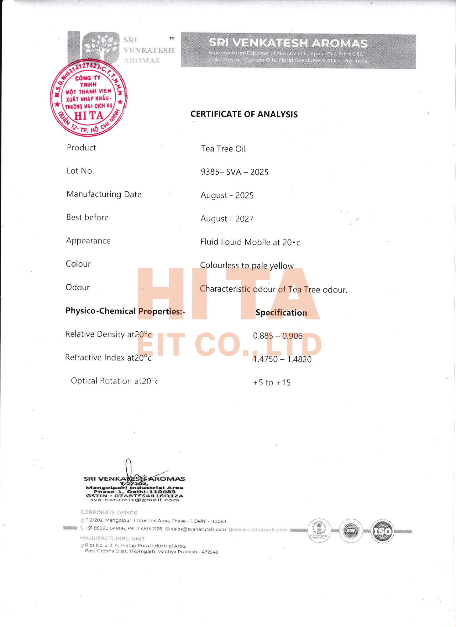 Đối với mỗi lô hàng 27 loại tinh dầu nhập khẩu từ Sri Venkatesh Aromas, chúng tôi đều sở hữu đầy đủ COA (Certificate of Analysis - Giấy chứng nhận phân tích) do phòng thí nghiệm của nhà sản xuất hoặc đơn vị kiểm định độc lập cấp.