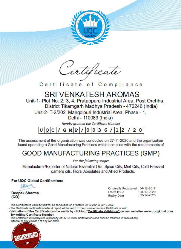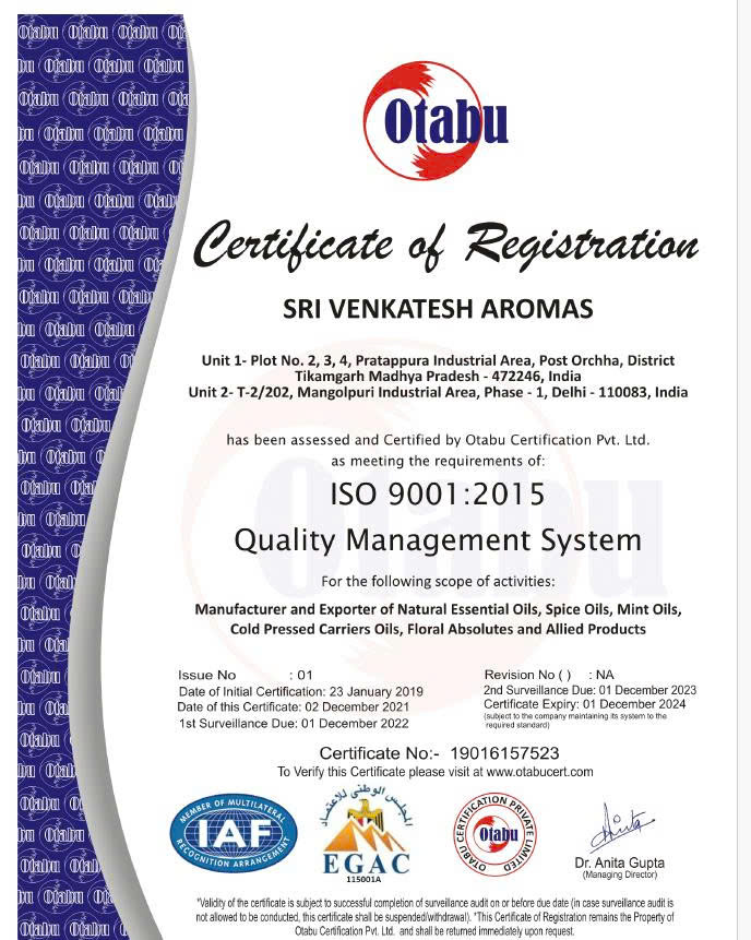 Để xuất khẩu đi khắp thế giới, các sản phẩm của Sri Venkatesh Aromas đều phải trải qua các quy trình kiểm định khắt khe. Nhà máy thường sở hữu các chứng nhận quan trọng trong ngành hương liệu (ví dụ như ISO, GMP, ... ).