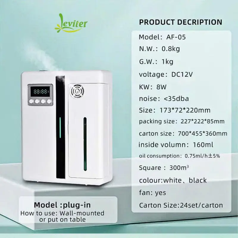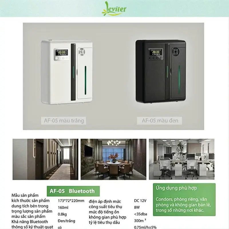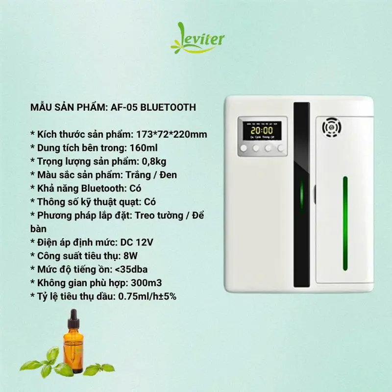 Máy Xông Tinh Dầu AF-05 Bluetooth với dung tích 160ml, công suất 8W, vận hành êm ái <35dba, phù hợp cho không gian rộng 300m³. Thiết kế treo tường hoặc để bàn tiện dụng, mang lại hương thơm dễ chịu và không gian thư giãn tối ưu.